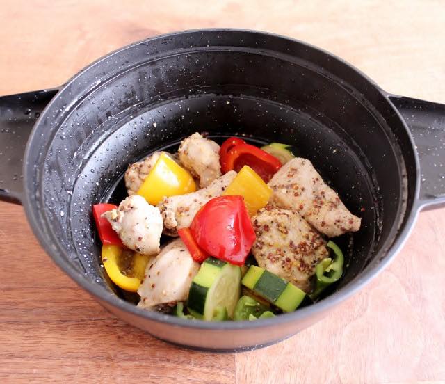 2. コランダーに肉、本体に野菜を入れる。コランダーを本体にセットし、蓋をして、電子レンジ600W 3分加熱する。