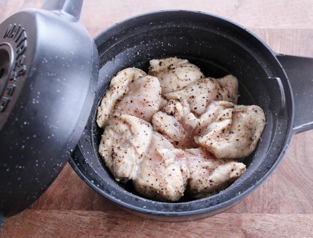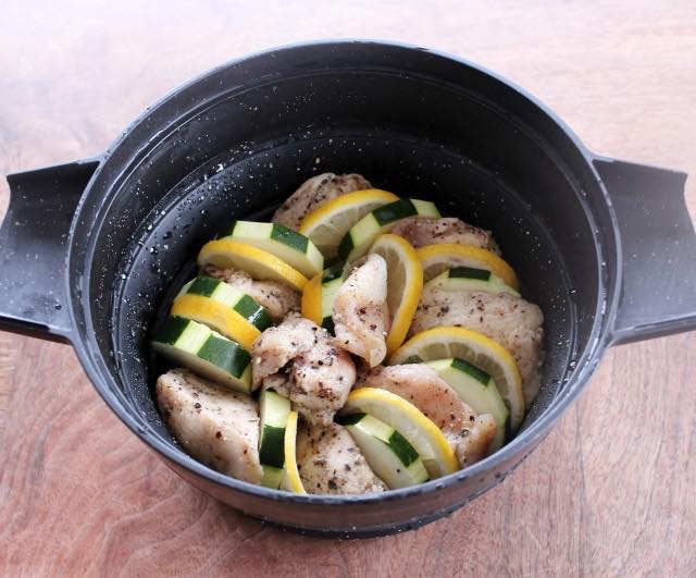 3. 本体に肉、ズッキーニ—、レモンを均等に並べ、調味料を回しかける。蓋をして、600W 4分加熱する。