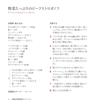 野菜たっぷりのビーフストロガノフ?作り方1牛肉は1cm幅で4cmの長さに切り、塩こしょうをし、オリーブオイル、薄力粉とパプリカ(粉末)をまぶしておく。2パプリカ(赤・黄)は1cm幅に切り、半分の長さに切る。ズッキーニは5mmの厚さの斜めに切り、棒状に切る。3かぼちゃは種を取り、軽く電子レンジで加熱してから、1cmの厚さ、3cmの長さのくし切りにする。エリンギは縦3〜4等分に切り3cmの長さに切る。4大きめのボウルに2と3の野菜、塩こしょう、オリーブオイルを入れ、全体にからめておく。5別のボウルにAを入れてよく混ぜておく。6スチーマーに、4の野菜を下に敷きつめ、その上に1の牛肉を広げてのせ、Aを上からかけ蓋をして電子レンジ600Wで6分加熱する。7一旦取り出して、全体をかき混ぜ、蓋をして更に電子レンジ600Wで5分加熱する。8蓋をしたまま5分蒸らす。Leboeufstroganoffetseslegumes?材料(約4人分)牛もも肉(ステーキ用)……200g塩……少々こしょう……少々オリーブオイル……大さじ1薄力粉……大さじ11パプリカ(粉末)……大さじ1パプリカ(赤)……1個パプリカ(黄)……1個ズッキーニ……1個かぼちゃ……1個エリンギ……1個塩……適宜こしょう……適宜オリーブオイル……20?玉ねぎ(細かいみじん切り)……1個ビーフコンソメ……130?生クリーム……55gサワークリーム……25gパプリカ(粉末)……大さじ2塩……少々こしょう……少々?使用スチーマーオーバルA10Livretrecettes
