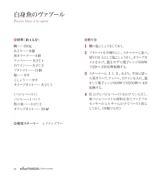 白身魚のヴァプール?作り方1鯛に塩こしょうをしておく。2プチトマトを半割りにし、スチーマーに並べ、切り口を上にして塩こしょうをし、オリーブオイルをかけ、蓋をせずに電子レンジ600Wで2分〜2分30秒加熱する。3スチーマーに1と2、あさり、半分に切った黒オリーブ、ケッパー、白ワインを入れ、蓋をして電子レンジ600Wで3分30秒〜4分加熱する。4仕上げにバジルペーストをかけていただく。※バジルペーストは材料を全てフードプロセッサーかミルサーにかけてペースト状にしておく。(市販でも可)Poissonblancalavapeur?材料(約4人分)鯛……200gあさり……8個黒オリーブ……4個ケッパー……大さじ1白ワイン……大さじ2プチトマト……15個塩……少々こしょう……少々オリーブオイル……大さじ1〈バジルペースト〉バジル……1パック松の実……小さじ2オリーブオイル……50??使用スチーマーレクタングラー12Livretrecettes