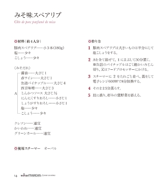みそ味スペアリブ?作り方1豚肉スペアリブは大きいものは半分にして塩こしょうをする。2Aを全て混ぜて、1にまぶして30分置く。※缶詰のパイナップルはごく細かいみじん切り、又はフードプロセッサーにかける。3スチーマーに2をたれごと並べ、蓋をして電子レンジ600Wで8分加熱する。4そのまま5分蒸らす。5皿に盛り、好みの葉野菜を添える。Cotedeporcparfumedemiso?材料(約4人分)豚肉スペアリブ……小3本(180g)塩……少々こしょう……少々〈みそだれ〉醤油……大さじ1赤ワイン……大さじ1缶詰パイナップル……大さじ4西京味噌……大さじ3とんかつソース大さじ1にんにくすりおろし……小さじ1しょうがすりおろし……小さじ1塩……少々こしょう……少々クレソン……適宜かいわれ……適宜グリーンカール……適宜?使用スチーマーオーバルA14Livretrecettes