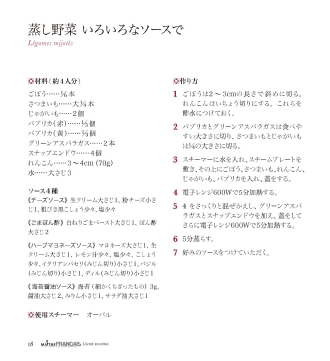 蒸し野菜いろいろなソースで?作り方1ごぼうは2〜3cmの長さで斜めに切る。れんこんはいちょう切りにする。これらを酢水につけておく。2パプリカとグリーンアスパラガスは食べやすい大きさに切り、さつまいもとじゃがいもは1の大きさに切る。3スチーマーに水を入れ、スチームプレートを敷き、その上にごぼう、さつまいも、れんこん、じゃがいも、パプリカを入れ、蓋をする。4電子レンジ600Wで5分加熱する。54をさっくりと混ぜかえし、グリーンアスパラガスとスナップエンドウを加え、蓋をしてさらに電子レンジ600Wで5分加熱する。65分蒸らす。7好みのソースをつけていただく。Legumesmijotes?材料(約4人分)ごぼう……1本さつまいも……大1本じゃがいも……2個パプリカ(赤)……1個パプリカ(黄)……1個グリーンアスパラガス……2本スナップエンドウ……4個れんこん……3?4cm(70g)水……大さじ3ソース4種《チーズソース》生クリーム大さじ1、粉チーズ小さじ1、粗びき黒こしょう少々、塩少々《ごまぽん酢》白ねりごまペースト大さじ1、ぽん酢大さじ2《ハーブマヨネーズソース》マヨネーズ大さじ1、生クリーム大さじ1、レモン汁少々、塩少々、こしょう少々、イタリアンパセリ(みじん切り)小さじ1、バジル(みじん切り)小さじ1、ディル(みじん切り)小さじ1《海苔醤油ソース》海苔(細かくちぎったもの)3g、醤油大さじ2、みりん小さじ1、サラダ油大さじ1?使用スチーマーオーバル18Livretrecettes