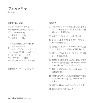フォカッチャ?作り方1ボウルにドライイーストを入れ、ぬるま湯とグラニュー糖を加えてよく溶き、5分ほど室温において発酵させる。2Aをフードプロセッサーに軽くかける。32に1とBすべてを加えてフードプロセッサーに50秒かける。4生地を丸くまとめ、スチーマーに入れて、蓋をして電子レンジ200Wで40秒加熱する。5電子レンジから取り出してそのまま20分置き、一次発酵させる。6発酵したら打ち粉をした台に取り、手で少し叩いて空気を抜き、厚み1cmでスチーマーの底いっぱいの大きさにのばす。7蓋をして35℃のオーブンで30分加熱し、二次発酵させる。8二次発酵が終わったら、生地に箸で穴をあけ、オリーブオイルをふり、フール・ド・セルを散らす。9220℃に温めておいたオーブンで15分焼く。10飾りにバジルの葉をのせる。Focaccia?材料(約4人分)ドライイースト……1.75gぬるま湯(40℃)……大さじ1グラニュー糖……5g強力粉……125g薄力粉……30gぬるま湯(40℃)……85?塩……小さじ1オリーブオイル……小さじ11バジル(ドライ)……大さじ1フール・ド・セル……少々オリーブオイル……適宜バジルの葉(フレッシュ)……適宜?使用スチーマーレクタングラーAB44Livretrecettes
