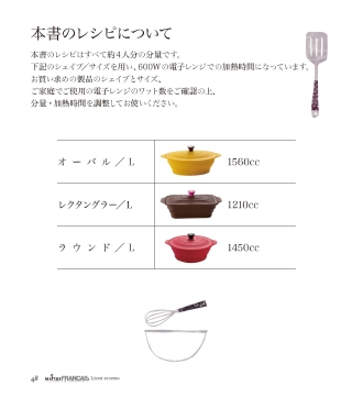 本書のレシピについて本書のレシピはすべて約4人分の分量です。下記のシェイプ/サイズを用い、600Wの電子レンジでの加熱時間になっています。お買い求めの製品のシェイプとサイズ、ご家庭でご使用の電子レンジのワット数をご確認の上、分量・加熱時間を調整してお使いください。オーバル/Lレクタングラー/Lラウンド/L1560cc1210cc1450cc48Livretrecettes
