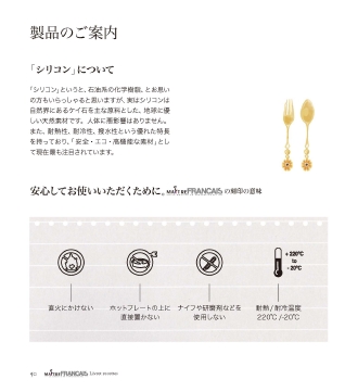 「シリコン」というと、石油系の化学樹脂、とお思いの方もいらっしゃると思いますが、実はシリコンは自然界にあるケイ石を主な原料とした、地球に優しい天然素材です。人体に悪影響はありません。また、耐熱性、耐冷性、撥水性という優れた特長を持っており、「安全・エコ・高機能な素材」として現在最も注目されています。「シリコン」について安心してお使いいただくために。の刻印の意味直火にかけない製品のご案内ホットプレートの上に直接置かないナイフや研磨剤などを使用しない耐熱/耐冷温度220℃/-20℃50Livretrecettes