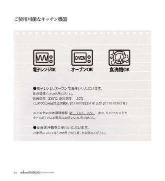 ●電子レンジ、オーブンでお使いいただけます。耐熱温度内でご使用ください。耐熱温度:220℃、耐冷温度:?20℃(日本文化用品安全試験所試11010222-1号及び試11010363号)※その他の加熱調理機器(オーブントースター、直火、IHクッキングヒーターなど)では本製品はお使いいただけません。●食器洗浄機をご使用いただけます。ご使用については「ご使用上の注意」をお読みください。ご使用可能なキッチン機器52Livretrecettes
