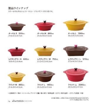 オーバルS500cc21.6×12.2×9.7cmオーバルM860cc25.5×14.0×11.2cmオーバルL1560cc30.2×16.5×13.3cmレクタングラーS440cc19.6×10.2×9.4cmレクタングラーM750cc23.2×12.2×10.2cmレクタングラーL1210cc27.0×14.5×11.0cmラウンドM860cc21.4×18.0×9.5cmラウンドL1450cc24.3×20.5×11.1cmラウンドLL2240cc28.0×24.0×11.7cmカラーはそれぞれショコラ・マロン・フランボワーズの3色です。製品ラインナップ※印刷の関係上、実物と写真との色味等が異なる場合があります。※サイズは製品の最大寸法です。<品質表示>素材:シリコンゴム/サイズ・容量:箱に表示/耐熱温度:220℃/耐冷温度:?20℃/生産国:中国54Livretrecettes